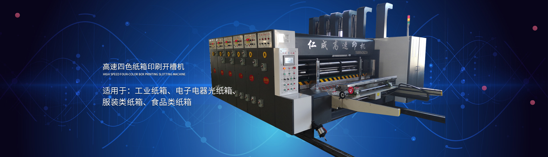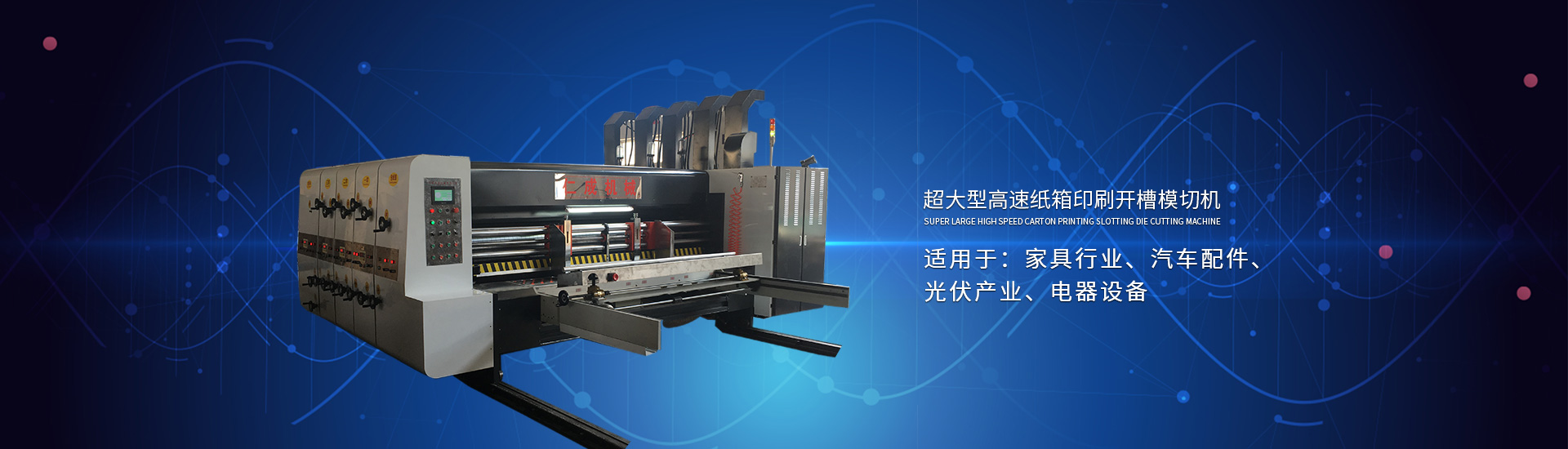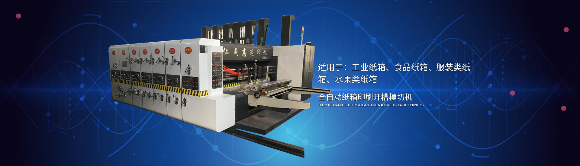 主要產(chǎn)品有高速印刷開(kāi)槽模切機(jī)、半自動(dòng)水墨印刷開(kāi)槽模切機(jī)、全自動(dòng)粘箱打包聯(lián)動(dòng)線、全自動(dòng) 插格機(jī)、半自動(dòng)粘箱機(jī)、半自動(dòng)釘箱機(jī)、手動(dòng)釘箱機(jī)、薄刀分紙機(jī)、PE繩打包機(jī)、PP帶智能打包 機(jī)、圓壓圓模切機(jī)、平壓壓痕機(jī)、自動(dòng)裱紙機(jī)、水墨污水處理機(jī)等產(chǎn)品
